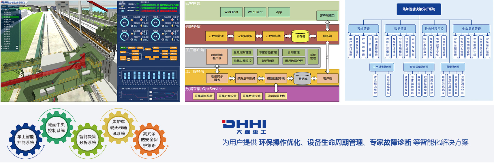 大連重工擁有焦爐機械專業(yè)化生產(chǎn)基地,設計、生產(chǎn)、制造的智能化焦爐機械設備已經(jīng)實現(xiàn)脫離操作或值守人員,按照生產(chǎn)計劃在無人操作模式下自動運行,具備危險源識別、智能決策、故障預防、故障報警停機等功能,可向客戶提供環(huán)保操作優(yōu)化、設備生命周期管理、專家故障診斷等智能化解決方案。