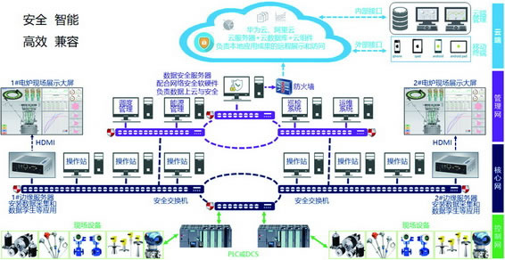優(yōu)勢(shì):包含控制網(wǎng)、核心網(wǎng)、管理網(wǎng)以及云端四級(jí)工廠網(wǎng)絡(luò),兼容開(kāi)放性好,設(shè)置軟硬件結(jié)合的縱深防御措施,安全性好,根據(jù)實(shí)時(shí)參數(shù),按照模型進(jìn)行仿真,推薦合理的運(yùn)行參數(shù),結(jié)合礦熱爐工藝參數(shù)、運(yùn)行參數(shù),計(jì)算出電極工作端實(shí)際位置